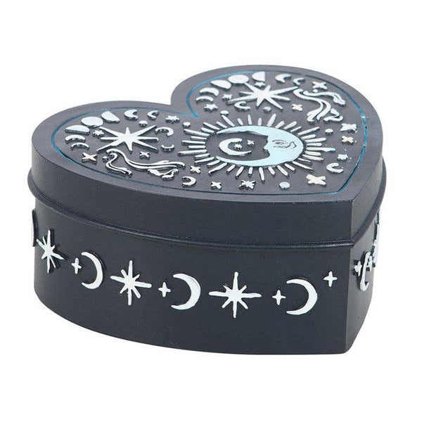 Store small treasures, keepsakes or crystals in this resin heart-shaped trinket box featuring a moonlit celestial design. A lovely decorative accent for dressing tables or bedside spaces.