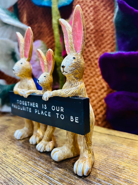 A unique bunny ornament with a sentiment plaque. A stylish interior decoration and gift item.