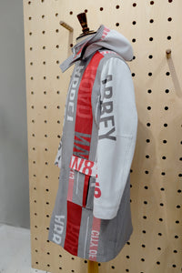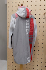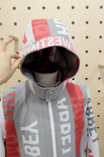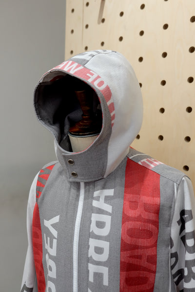 Front open end chunky zip opening. Front pleated patch lined pockets with flap. Hoodie hat with front overlapped closure with silver metal studs. Back yoke and back armhole extra movement panel. Back hem slit opening. no lined and binding seam finishings.