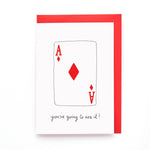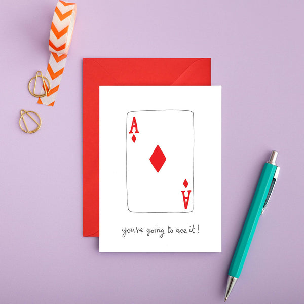 Something big and important is looming in the near future that requires a bit of good luck in the form of an encouragement card. A hand drawn playing card - the ace of diamonds - forms the feature on this good luck card, accompanied by the caption “you’re going to ace it” in a handwriting-style font. Send someone into a job interview, promotion negotiations, a driver’s licence test, or an exam with your own well wishes.