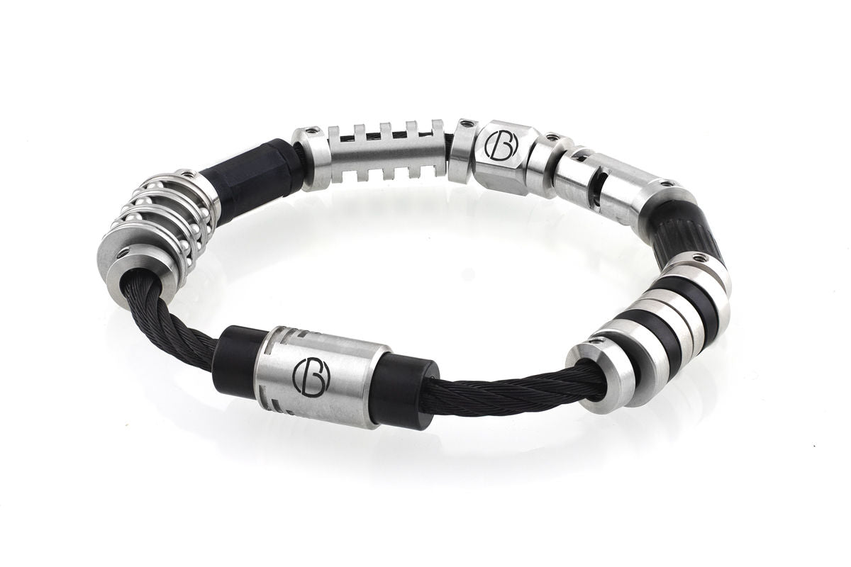 The Fully Loaded Midnight CABLE bracelet is a sleek blend of Polished Black PVD set off beautifully by classic stainless steel. Fully loaded up with seven marine grade 316L stainless steel beads - stainless Chaser, Polished Black Filter bead, stainless Jacob’s Ladder, Bailey of Sheffield Signature bead, stainless Piet, Polished Black EQ, and a Mixer Bead with stainless and Polished Black Romers.