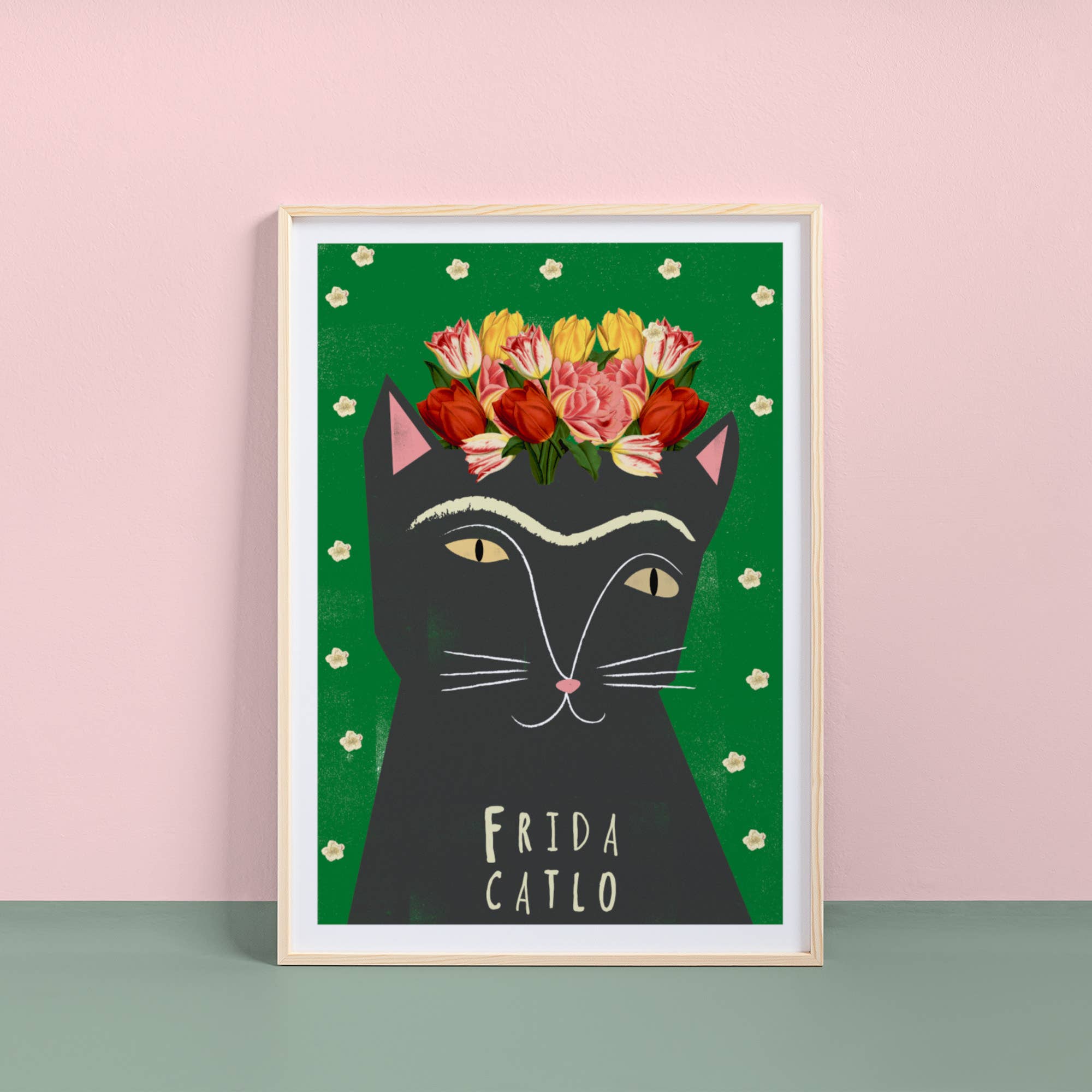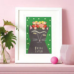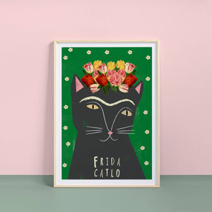 Inspired by the artist 'Frida Kahlo'. This print is a fun whisker twisting take on the artist, now reimagined as 'Frida Catlo'
