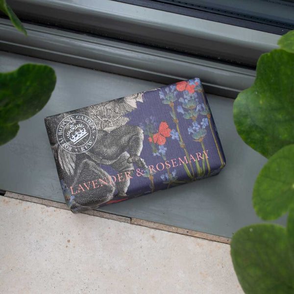 Kew Gardens Lavender and Rosemary Soap is one of the exclusive soap bars in the Kew Gardens Collection. A generously sized 240g bar that is long-lasting and enriched with moisturising shea butter and vegetable glycerine to nourish and care for the skin. The paper wraps are printed with beautiful illustrations inspired by the plants, from Kew Garden’s historical archives.