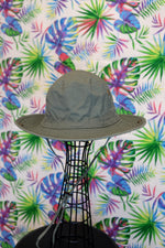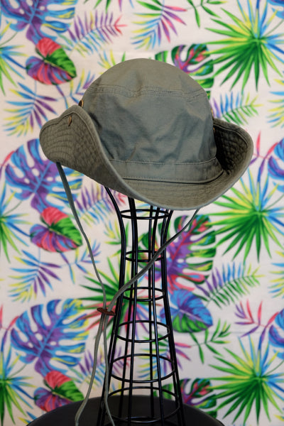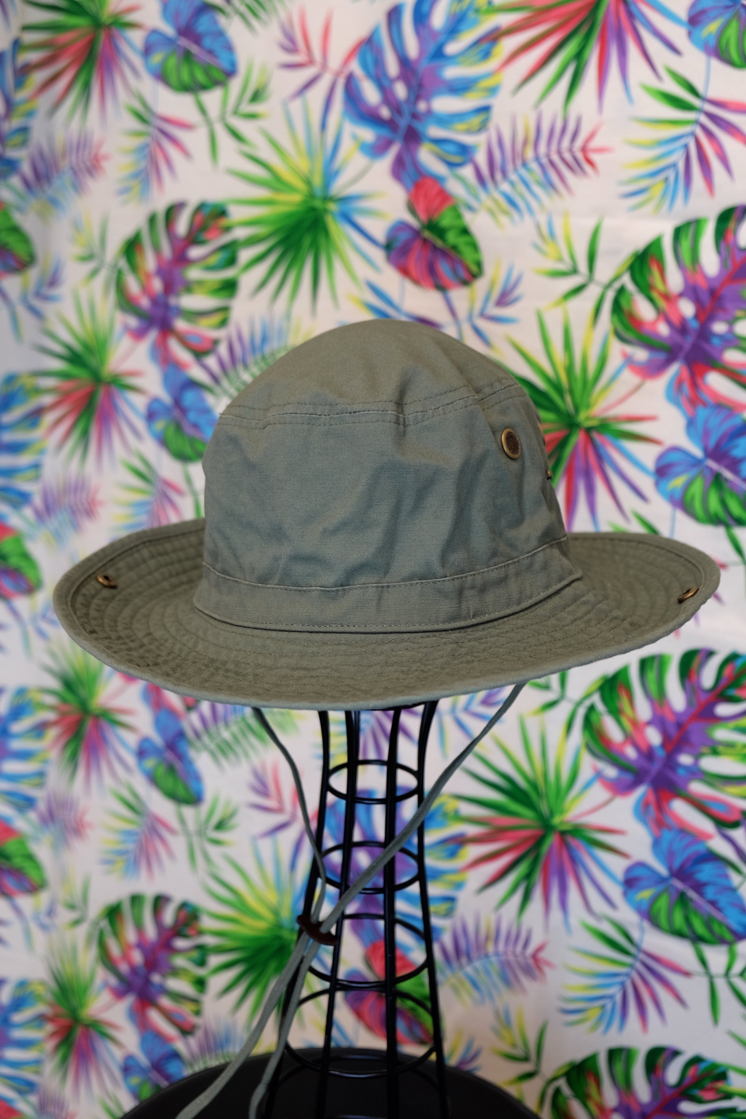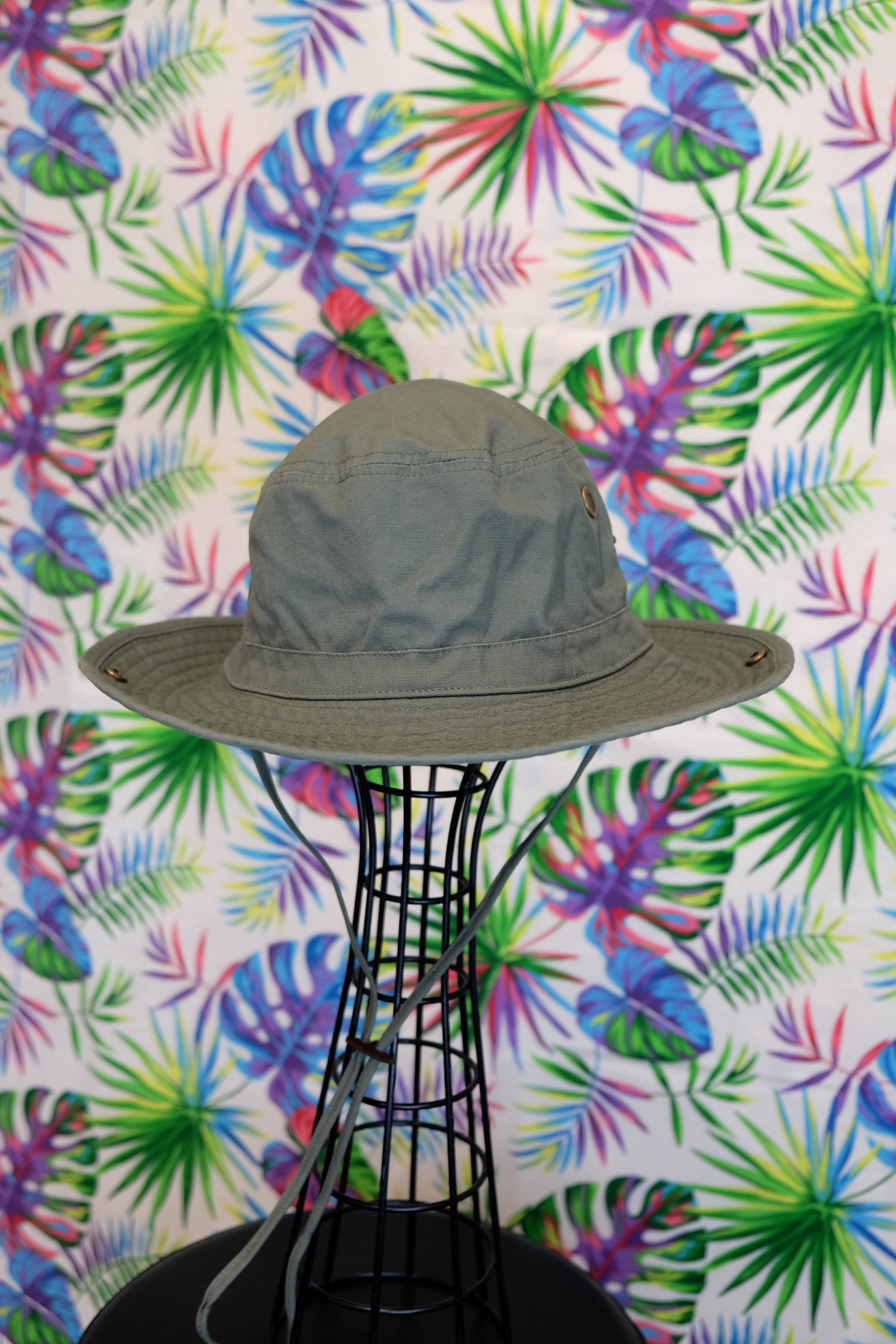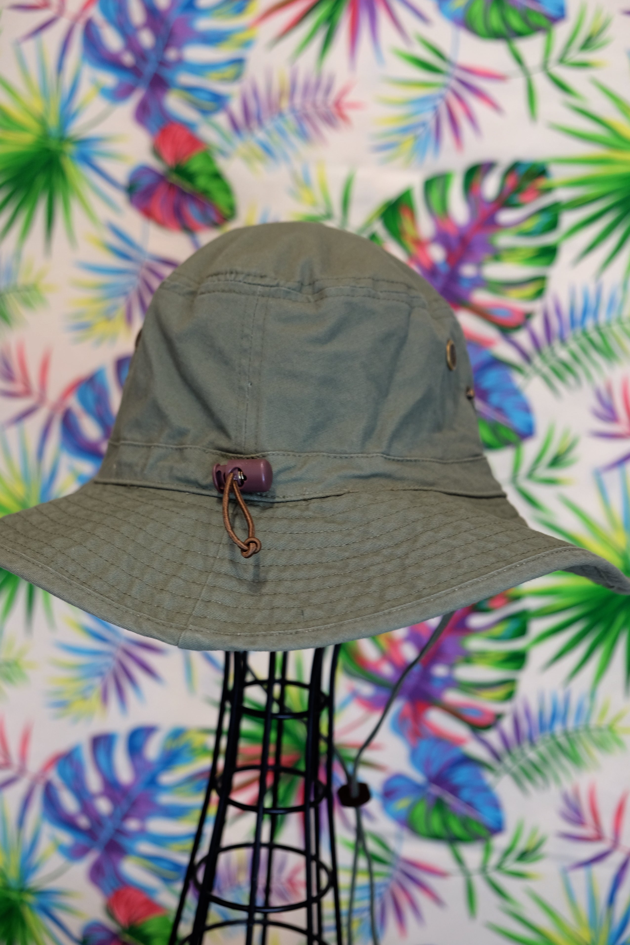 One size fits most. Chin strap with leather toggle. Mesh eyelets. Press stud side turn-ups. Elasticated cord size adjuster with toggle.
