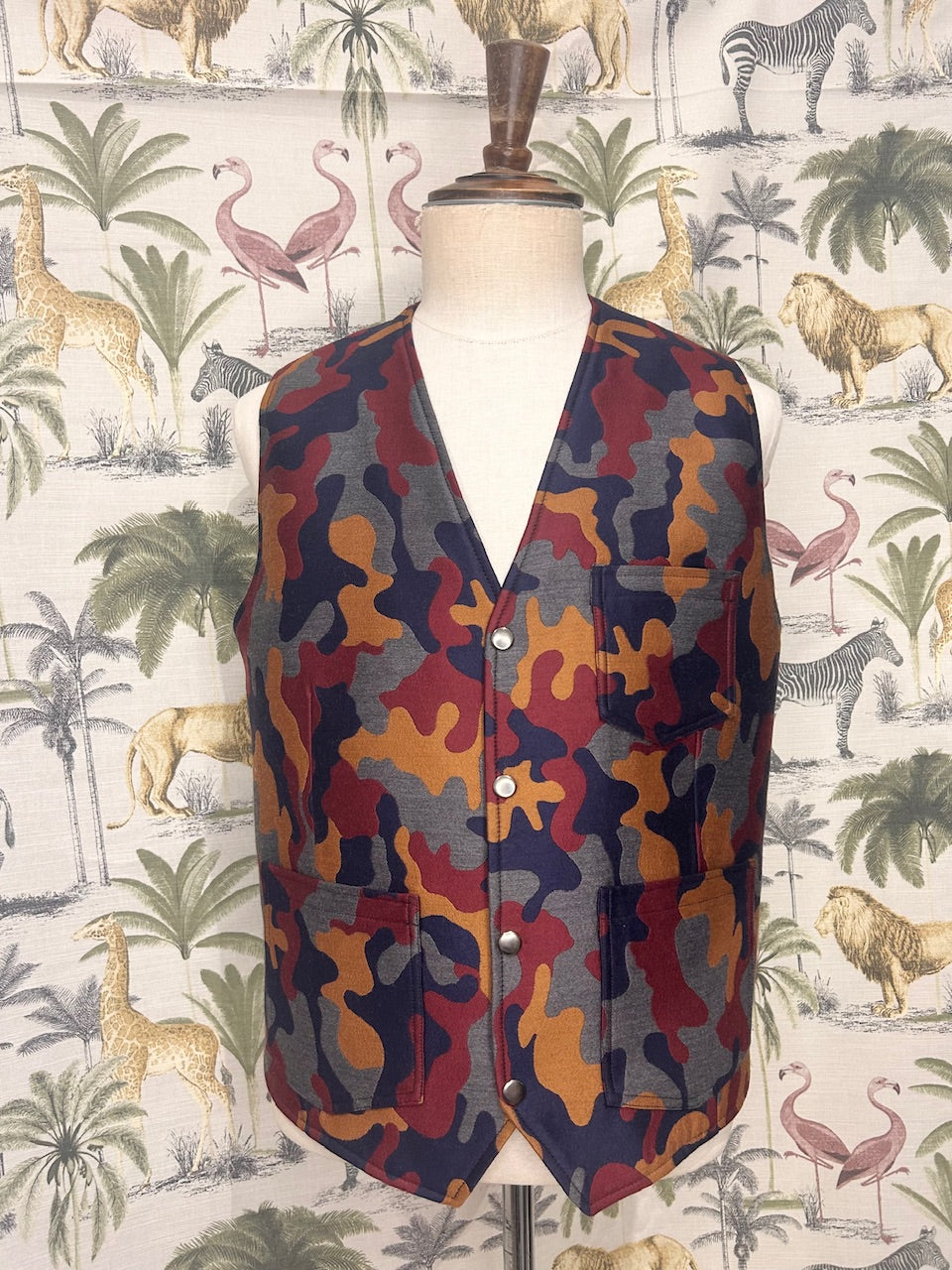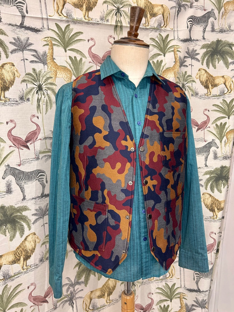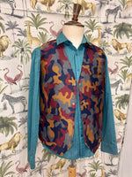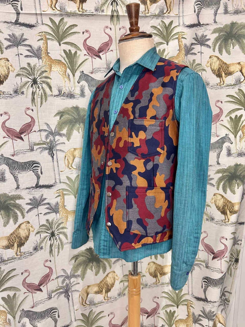100% wool silk mixed camouflage pattern for front panel. Printed Japanese cotton for back panel. Metal studs closure. Front patch pockets and left inside mobile phone size inside pocket. Full lined.