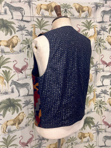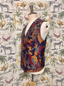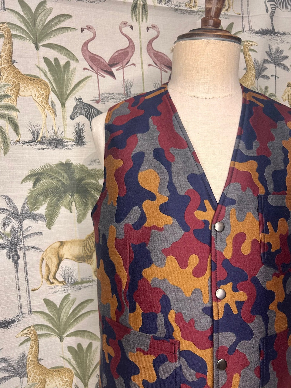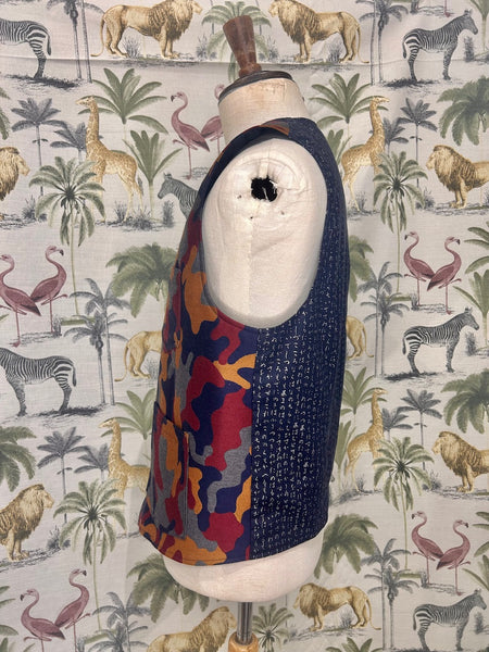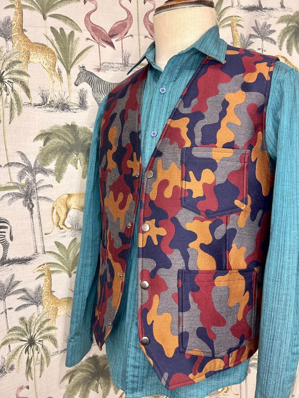 100% wool silk mixed camouflage pattern for front panel. Printed Japanese cotton for back panel. Metal studs closure. Front patch pockets and left inside mobile phone size inside pocket. Full lined.