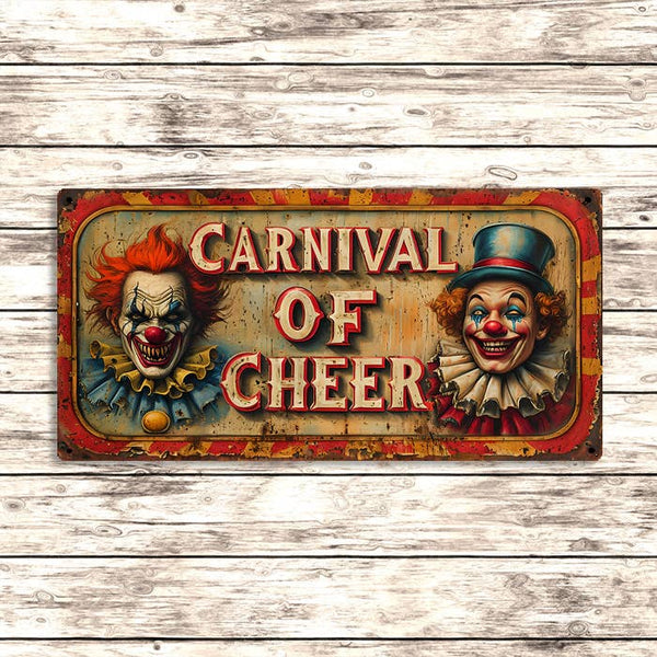 Carnival of Cheer Metal Sign – Vintage Clown Circus Decor: 24x12inch