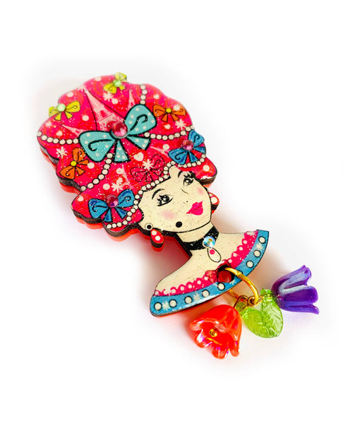 'The Antoinette queen of Paris brooch' Please welcome our beautifully illustrated Paris Antoinette brooch... she just delightful. Check out her french wig with Paris themed beads and dangle glass flower... such the best brooch gift full of colour and sparkle dazzle!