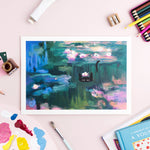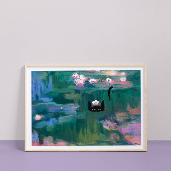 Inspired by the work of the artist 'Claude Monet'. This print is a fun whisker twisting take on the artwork 'Water Lillies', now reimagined as 'Claws Meow'