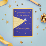Size: 105mm x 150mm. Supplied with yellow envelope. Blank inside 300gsm star-fine white paper Hot foil finishing FSC-certified acid-free card stock Hand drawn and printed in the UK.