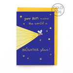 An authentic, one of a kind greeting card baring a humorous, tongue in cheek message. The original, hand drawn design of a glowing firefly is just waiting to light up someone's day. The message on the front of this wonderfully witty greeting card reads "Your BUM makes the world a BRIGHTER place".