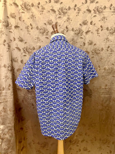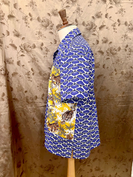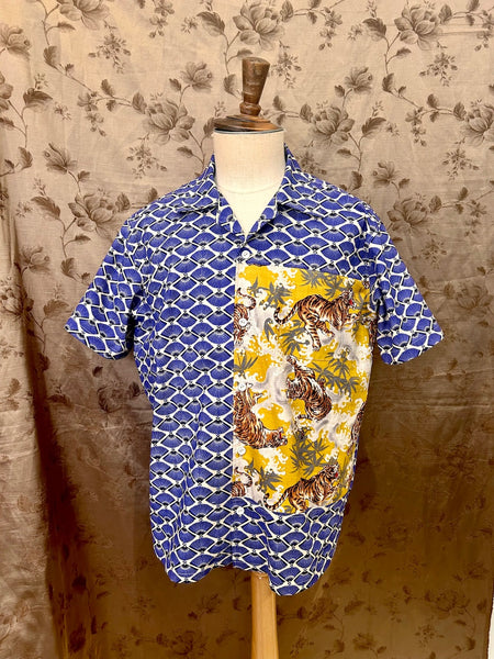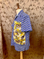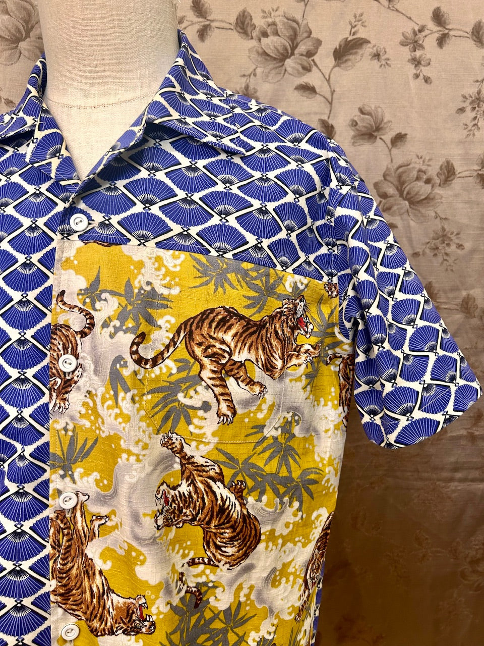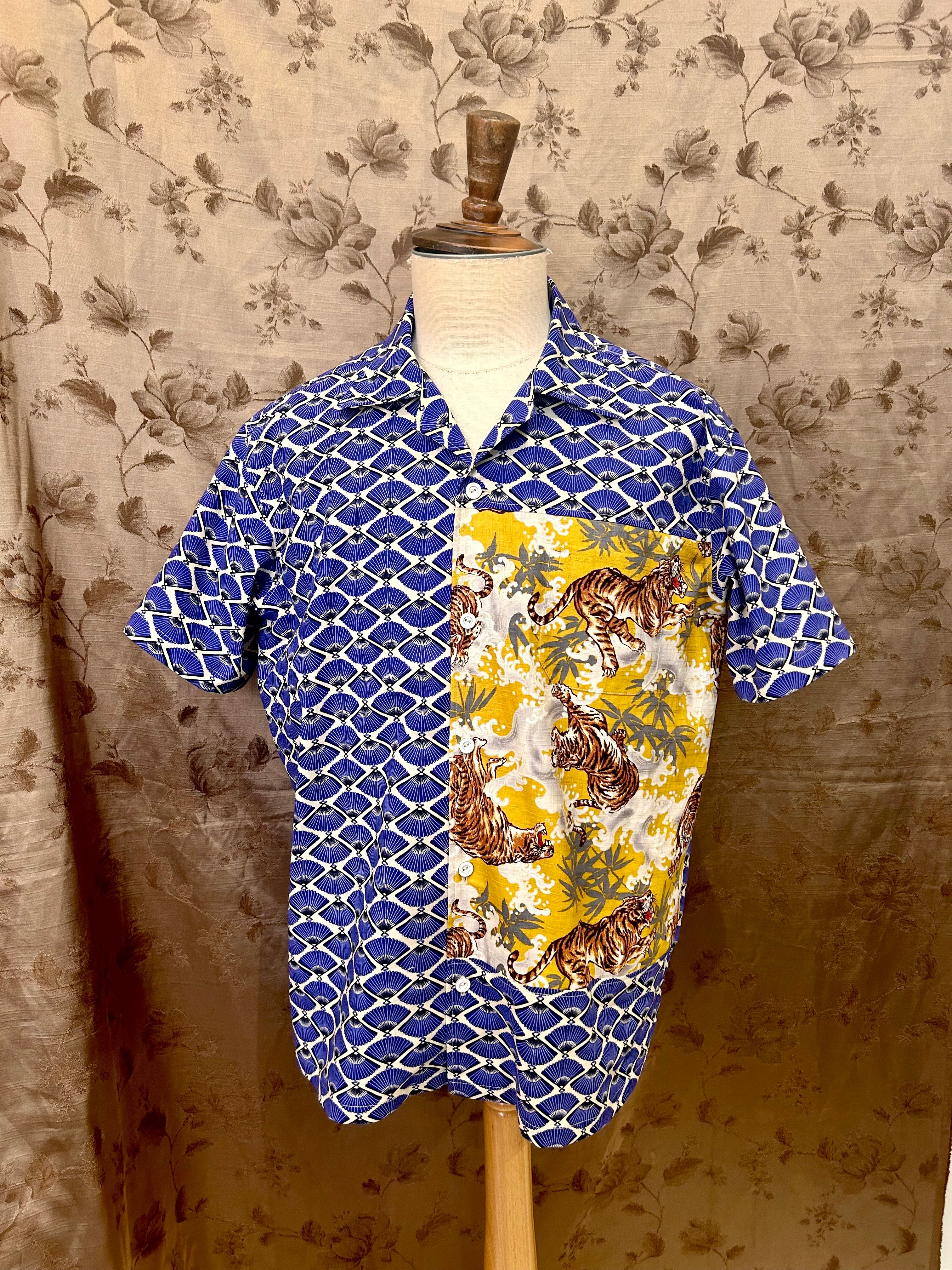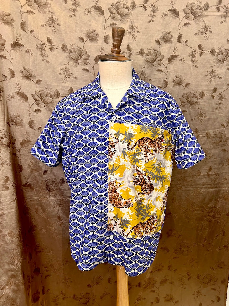 Camp collar relaxed fit cotton shirt. Contrast backing detail on collar. Both side seam slits opening on hem. Front button closure. Yellow thread top stitch detail. Back yoke with pleats.