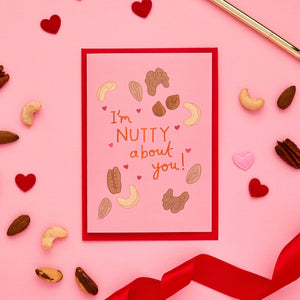 Witty love themed card, illustrated with a quirky hand drawn design featuring an assortment of nuts. Printed in the UK on FSC premium, recyclable paper. Written in a striking, hand lettered font and finished with gold foil, the message on the front of this authentic greeting card with a difference reads "I'm nutty about you".