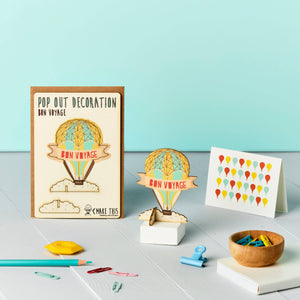 Pop out Bon Voyage card featuring blue and yellow hot air balloon with Bon Voyage banner, nestled in the clouds. Whether they're leaving for a new job or off on an adventure to pastures new, this is the perfect send off for your close friend or loved one.