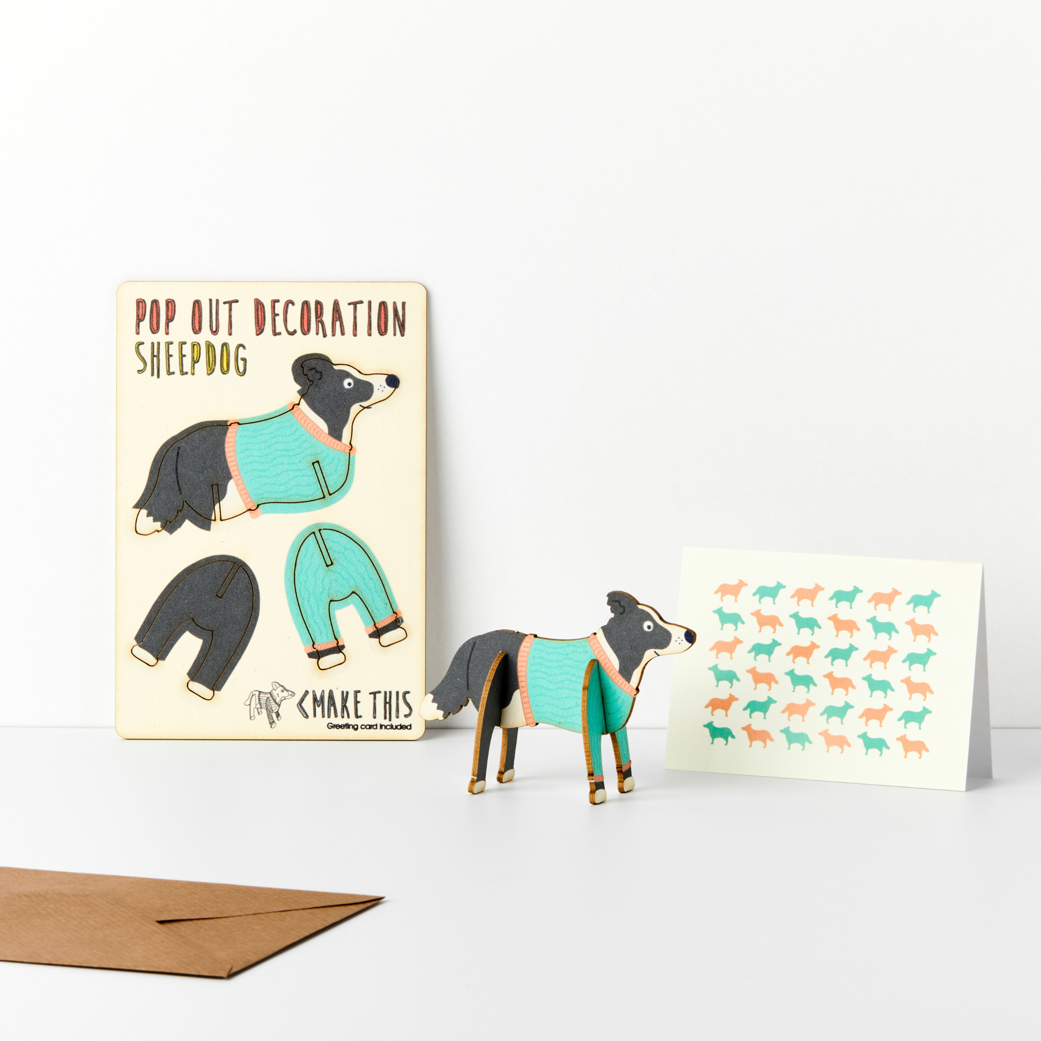 A delightful keepsake crafted using a 100% recyclable, eco-friendly material and lovingly made in the United Kingdom. Accompanied by: an A7 greeting card with repeat sheepdog pattern (left blank for your own message) and a brown A6 envelope.   'Pre-popped' decoration 106 x 156 mm |