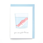 Celebrate the joys of aging with this hilariously witty birthday card. Featuring a hand-drawn illustration of false teeth floating in a glass of water, this playful design adds a cheeky twist to any birthday celebration. The clever, hand-lettered message on the front reads, "You are quite old now," making it perfect for someone with a great sense of humour.