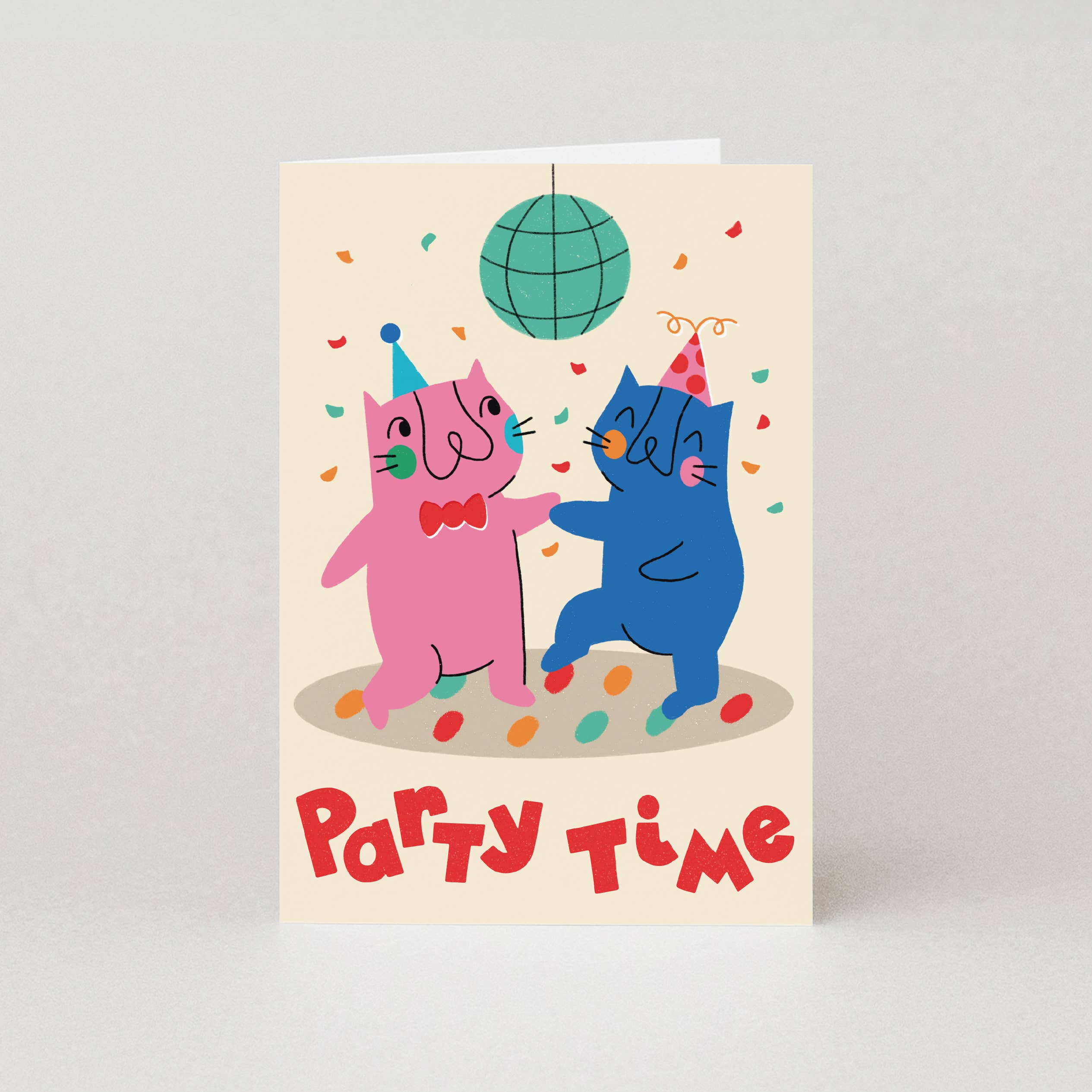 It's Party Time! Two colourful kitties in party hats are tearing up the dance floor on this birthday card, celebrating beneath a glimmering disco ball. The bold illustration on the disco birthday card is perfect for those friends who are always down for a boogie - the inside of the cat card is blank, so you can write your own handwritten messages with more suggestions on how to party!
